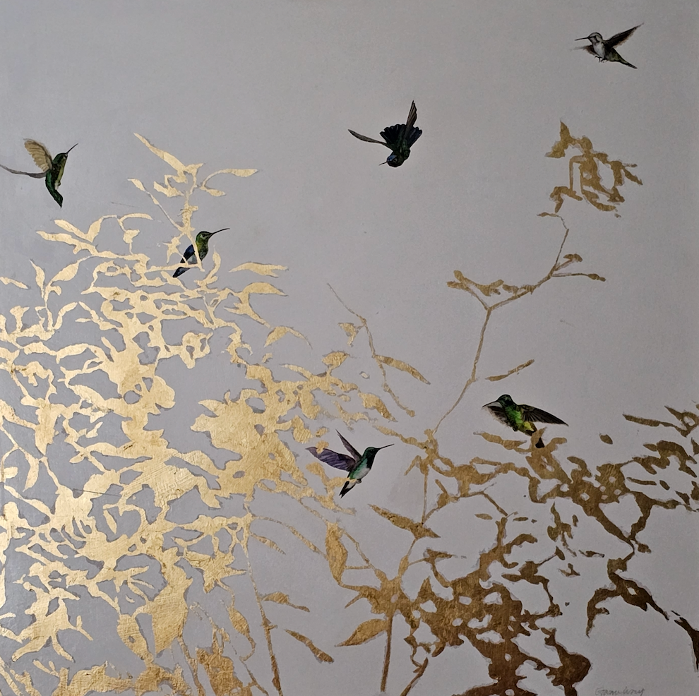 Lovely and serene hummingbird painting, by Gwen Wong. Her paintings are both representational and subjective in nature and represent a nostalgic nod to the past, present and future. A fourth generation Chinese American, Gwen has a BFA in Scientific Illustration and currently lives in Augusta, Georgia.
