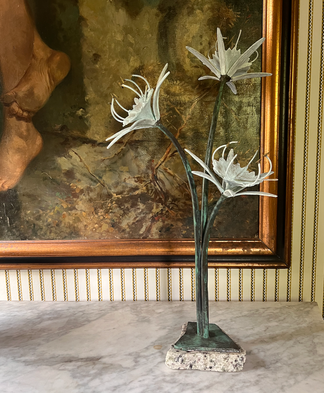Triple Bronze Cahaba Lilly sculpture by well know Alabama sculptor, Brad Morton .Bronze base on stone. Patinated flower piece in chalk white finish. Each piece unique .