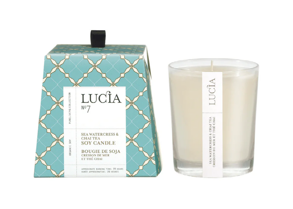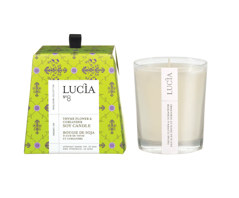 No. 8 Indulge and treat yourself to a relaxing evening at home with the exquisite floral symphony of Thyme Flower & Coriander. Blended with pure essential oils and natural 100% organic Soy. Burning cleanly for many hours all Lucia candles are a safe and environmentally friendly alternative to existing petroleum based paraffin candles. Our organic Soy is sourced from farming collectives all over the world encouraging fair-trade communities.