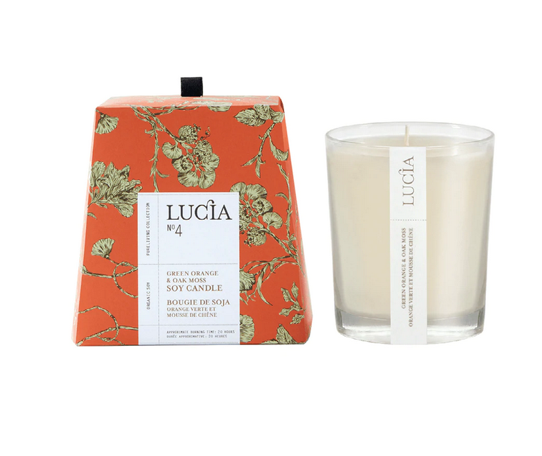 No. 4 This grove fresh accord of green orange and citrus is made from pure essential oils and natural 100% organic soy. Burning cleanly for many hours all Lucia candles are a safe and environmentally friendly alternative to existing petroleum based paraffin candles. Our organic Soya is sourced from farming collectives all over the world encouraging fair-trade communities.