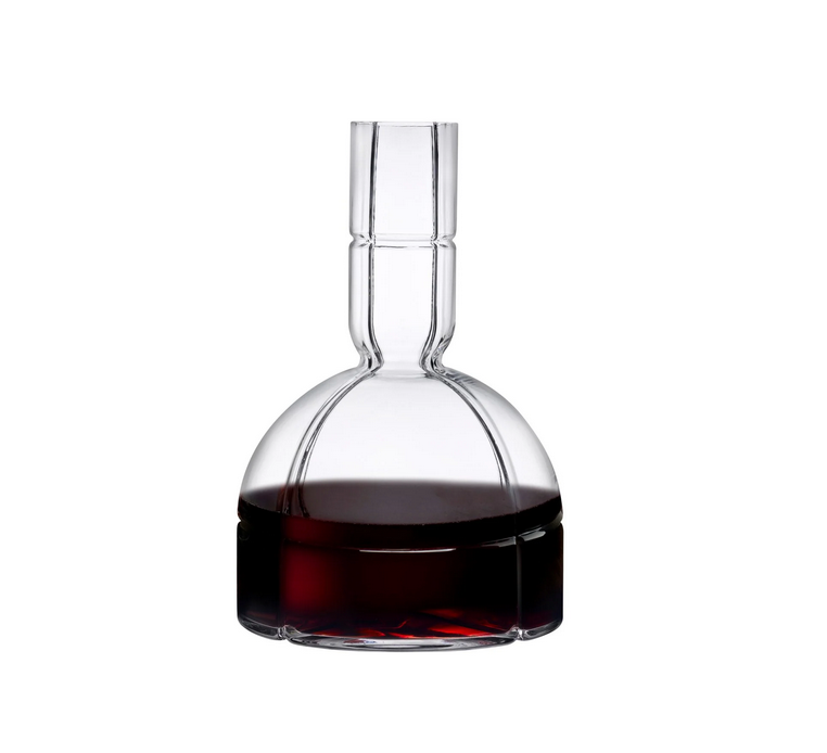 Crafted from lead-free crystal expertly etched with a series of intersecting perpendicular lines, this NUDE O2 wine carafe is simple yet aesthetically pleasing. The gently bulbous body rests atop a wide-bottomed base — softly domed, allowing the light to illuminate the piece from underneath — and crowned with an elegantly slender neck.
