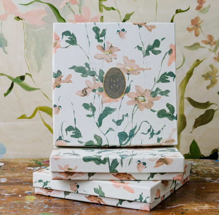 Twelve watercolor designs and letter-pressed numerals on 6" square cards. Nestled in a collectible linen box.