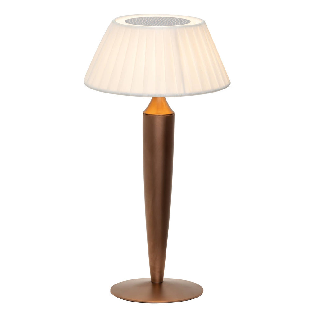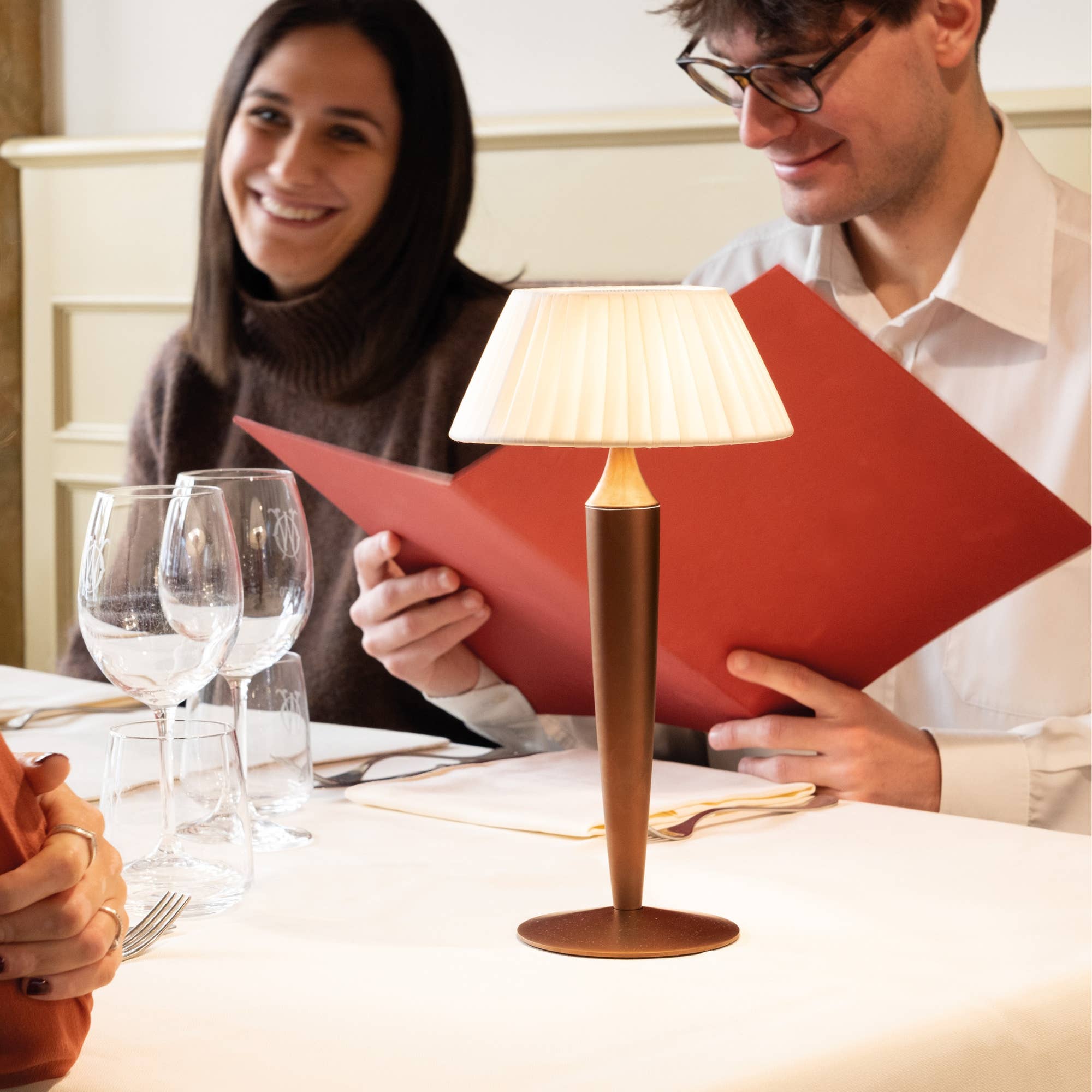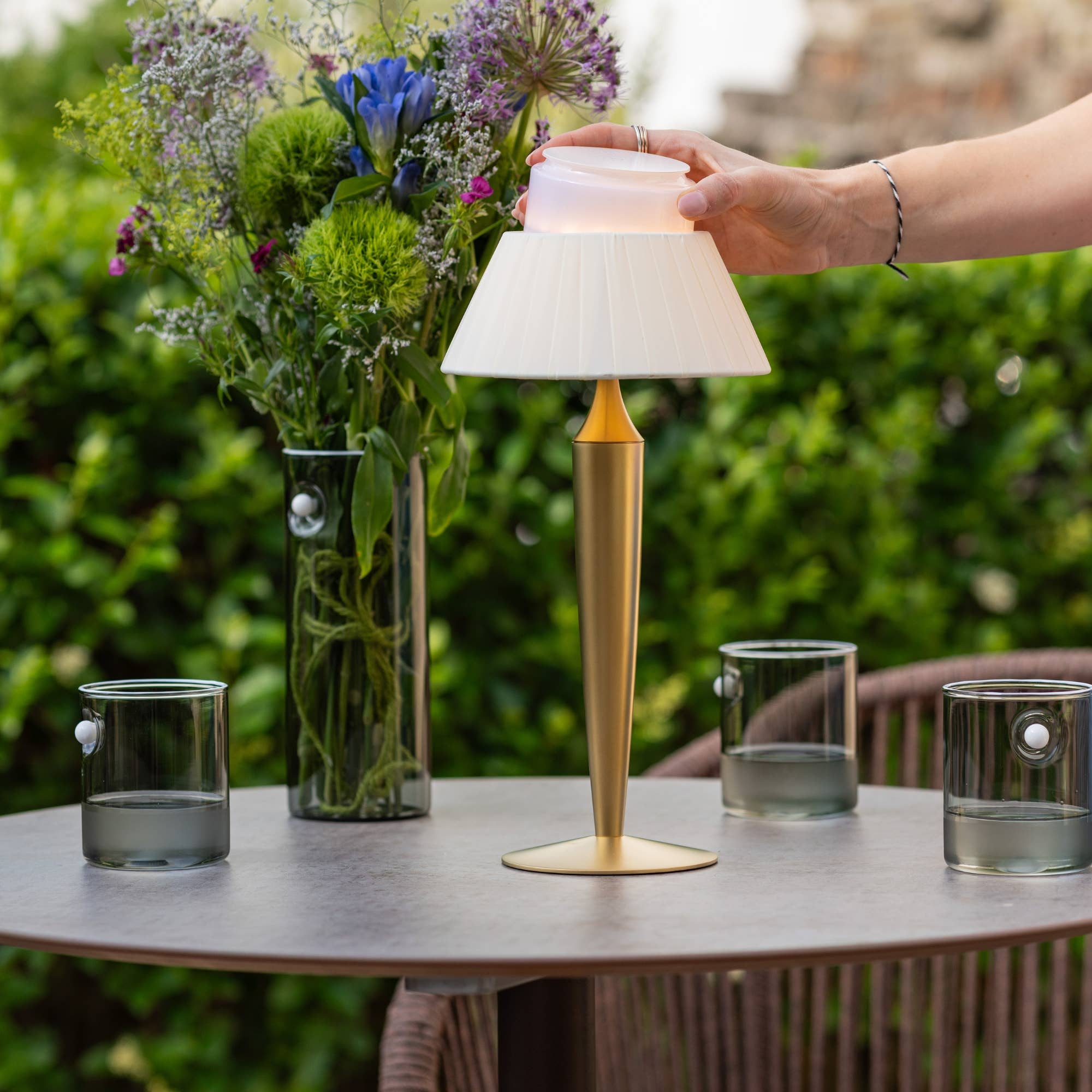 To recharge your Flaminia Pro, plug the provided charging base into an outlet, easily remove the LED Lighting Module from the lamp and place it on the base. The top of the module will glow red while charging and turn green once the charging cycle is complete. A full charge takes around 5 hours. The fully charged lighting module may remain on the charging cradle without damaging the battery while the module remains off.