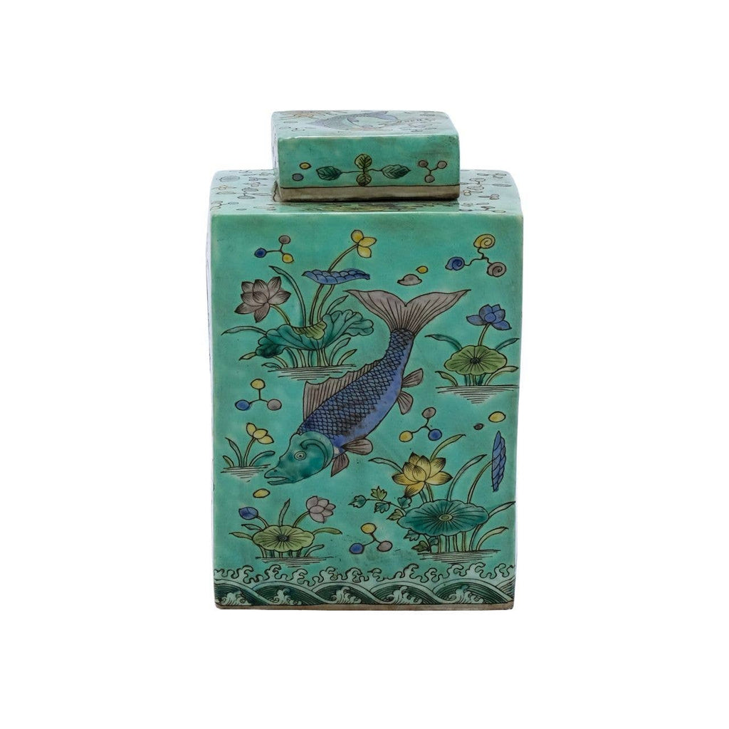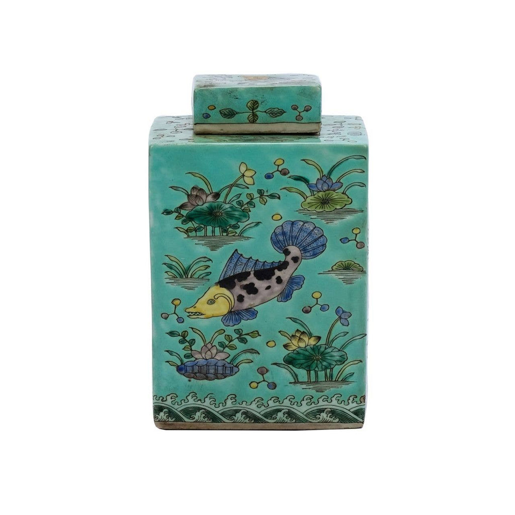 The Green Square Tea Jar Fish Motif is a unique, hand-made porcelain piece perfect for decoration. Each jar is carefully crafted and hand-painted, featuring a beautiful fish design. This high-fire porcelain jar is an antique reproduction, adding a touch of elegance to any space. Ideal for those who appreciate detailed and artistic decor. Size: 7in x 7 in x 12 in (W x D x H)