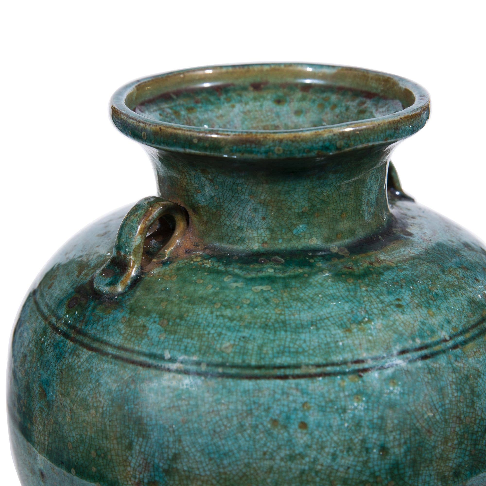 The Speckled Green Double Ear Greek Jar is a unique and beautiful piece for your home. It is hand made and hand painted from highfire porcelain, making it a great choice for decoration. This antique reproduction jar features a lovely speckled green color and has two handles, or "ears," on the sides. Perfect for adding an elegant touch to any room.