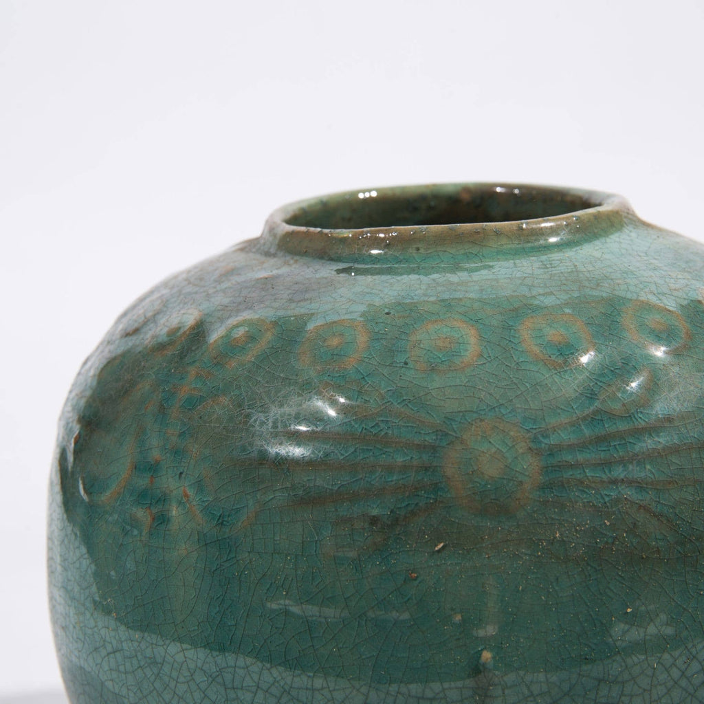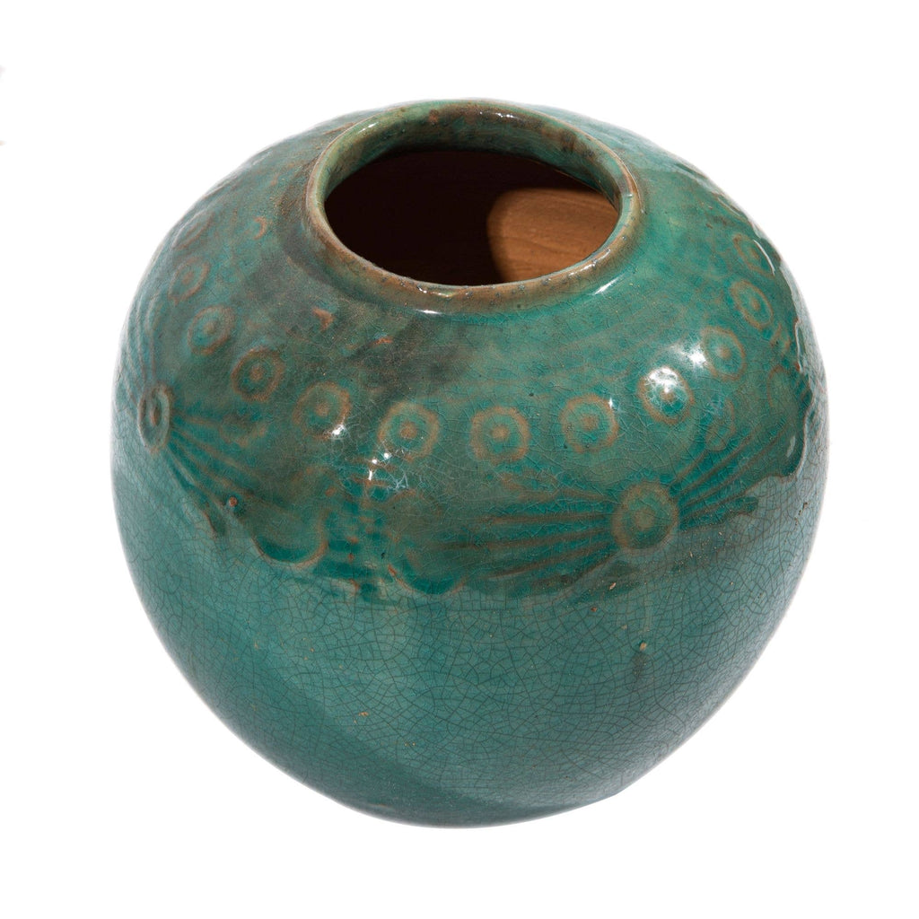 The Vintage Light Green Carved Jar Round is a unique handmade porcelain piece perfect for decoration. Handcrafted and hand-painted, this highfire porcelain jar is an antique reproduction. Its light green color and detailed carvings make it a beautiful addition to any space.