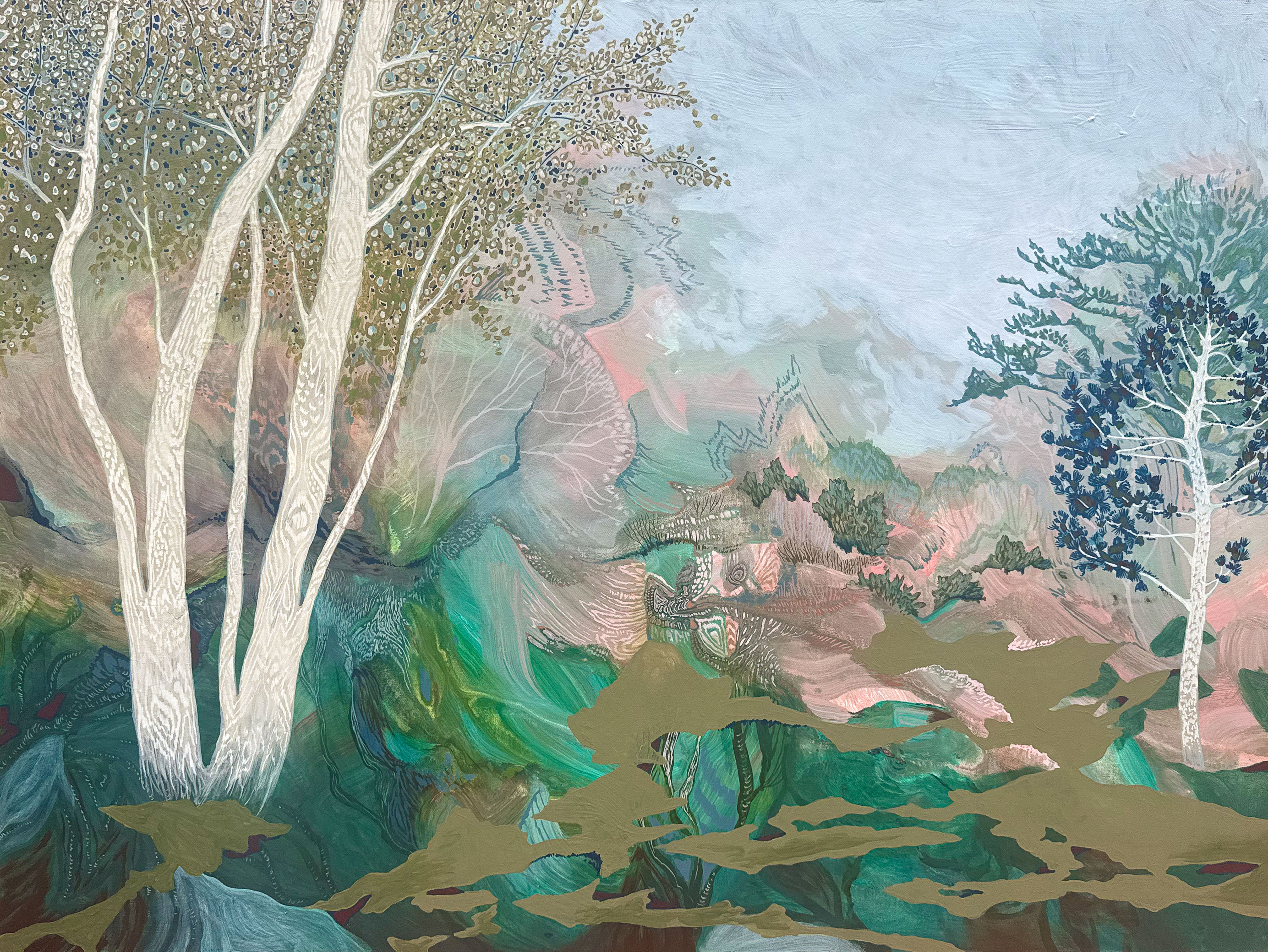 My original paintings explore the relationships between the world we live in and the worlds we sense, but can’t perceive directly. Phantasmagoric patterns riff in and out of natural subject matter, yielding imagery that is at once contemplative and energetic. When I paint, I examine the life forms and landscapes we so often take for granted, and try to conjure what their secret lives might reveal. My pieces weave together the fleeting and the eternal, the ordinary and the Divine.