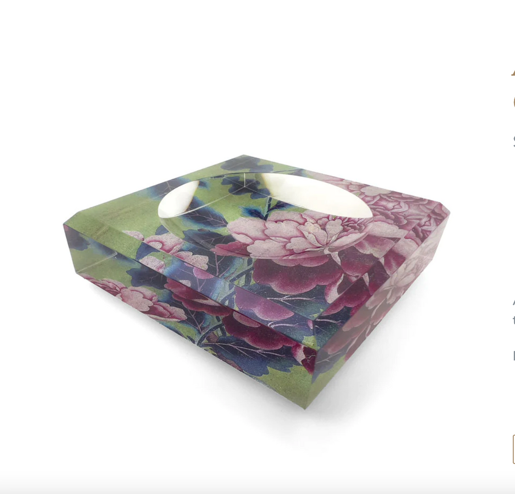 A beautiful block style acrylic soap dish in a green Chinoiserie print. This is the perfect accompaniment to our intaglio soaps.