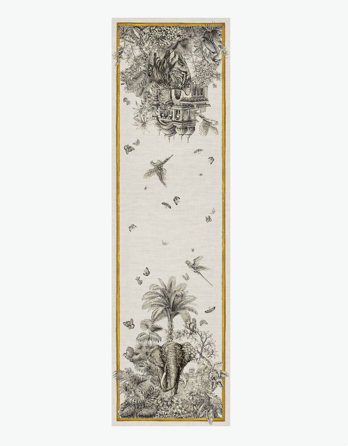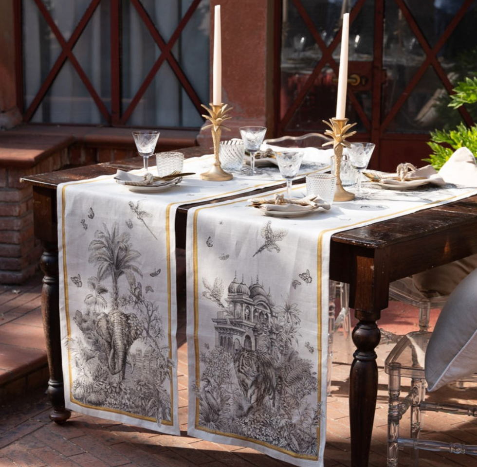 Decorate your table with the TANTRA runner in natural linen. Your home becomes a villa in Borneo in whose rooms in the evening you listen to the roars of the wild beasts that wander furtively among the ruins of ancient temples in the jungle.