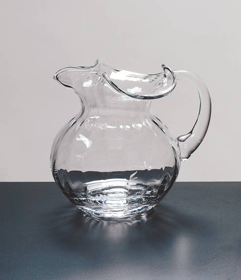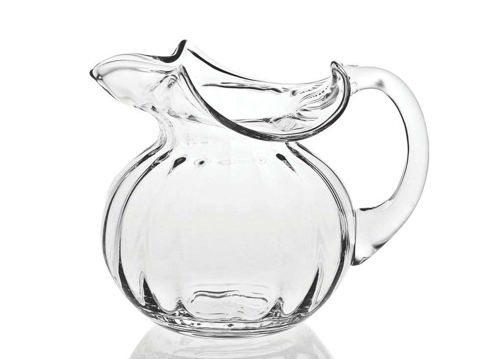 Floppy Optic Pitcher 42 oz.-one of our most popular gorgeous and practical pitchers. Mouth blown in Europe with optic waves in the lead free crystal and its unique round shape with floppy top makes this a standout on any table. Also known as the Harry pitcher for its popularity at the famed Manhattan bar