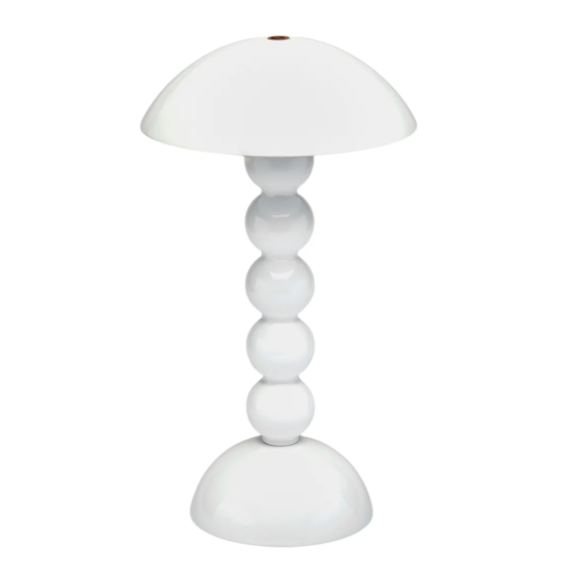 This White one-of-a-kind rechargeable lamp features a Bobbin-Shaped design. It offers up to 10 hours of battery life on its brightest setting and has three adjustable light levels.