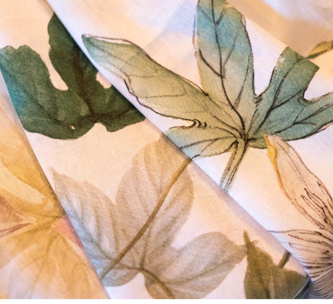 Passion fruit details are drawn on the pure bleached linen of the Granadilla table runner, an elegant piece to decorate your living room.