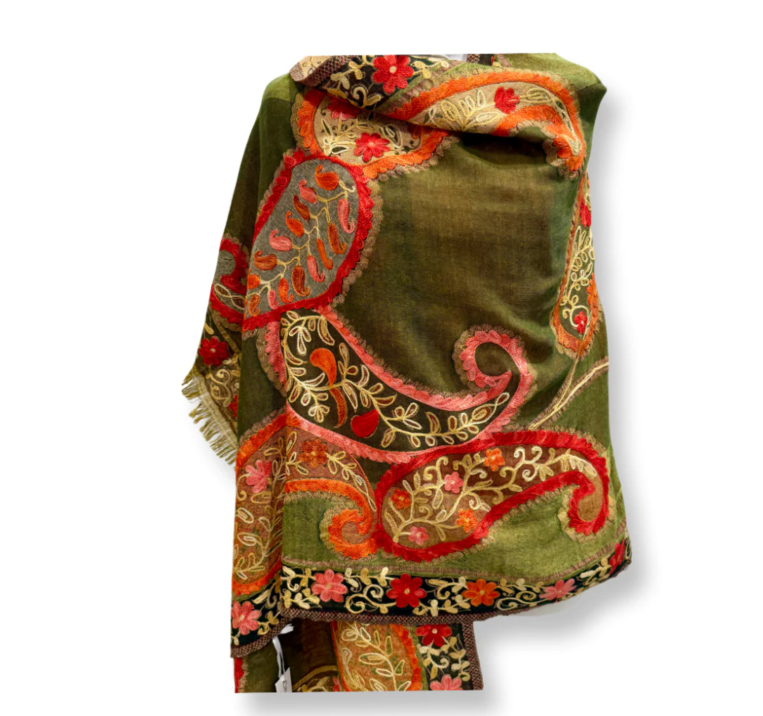 These embroidered shawls feature beautifully subtle yet bright multicolor designs. Expertly crafted by skilled artisans, each wrap showcases a harmonious blend of jacquard colors, complemented by intricate hand embroidery in vibrant hues.